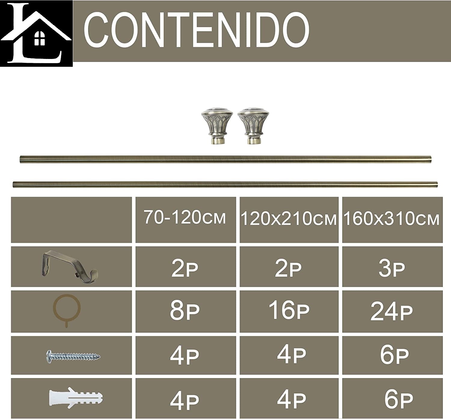 - CONTENIDO. 1 Barra de cortina, 3 soportes, 2 terminales, 16 anillos y materiales de fijación incluidos los tornillos y tacos.