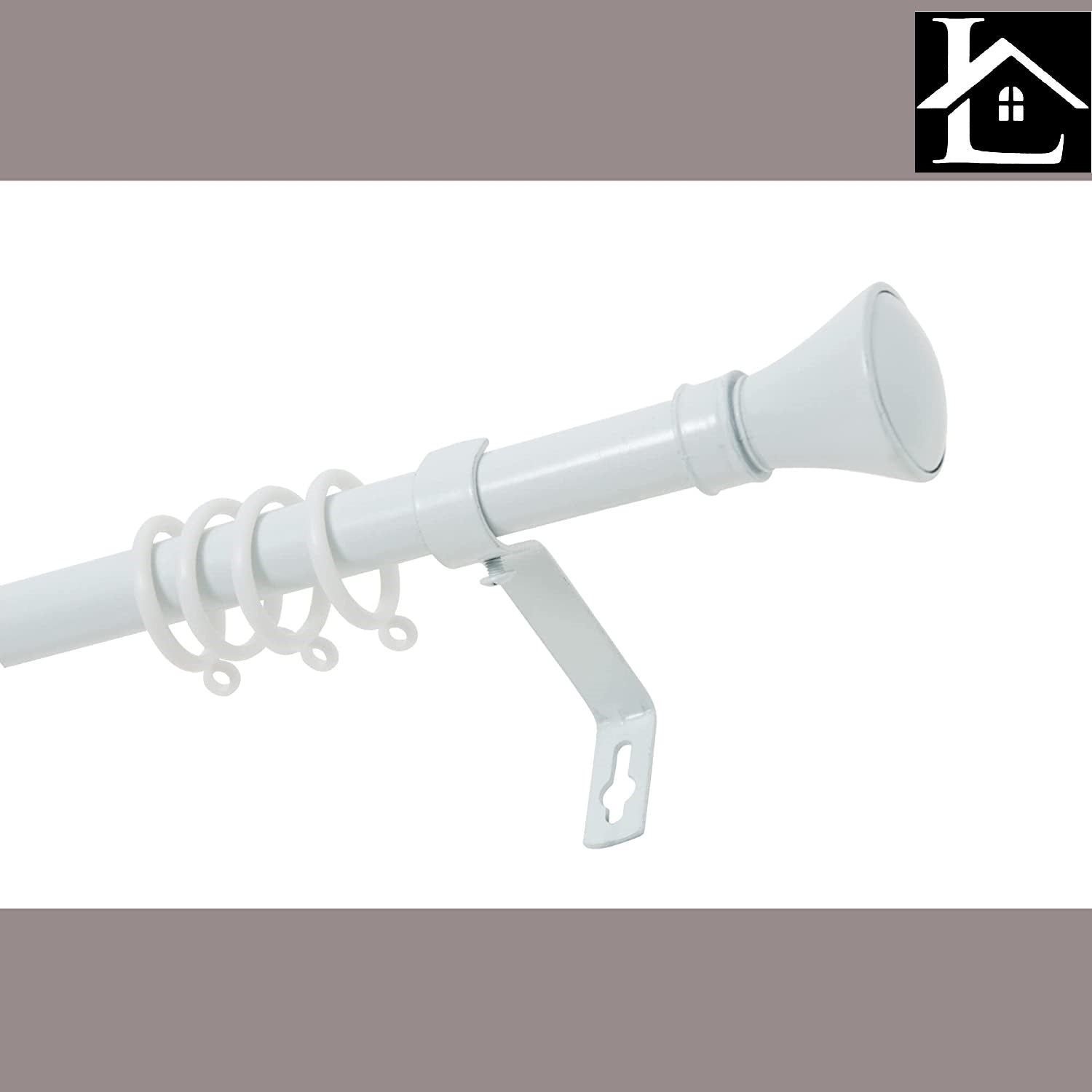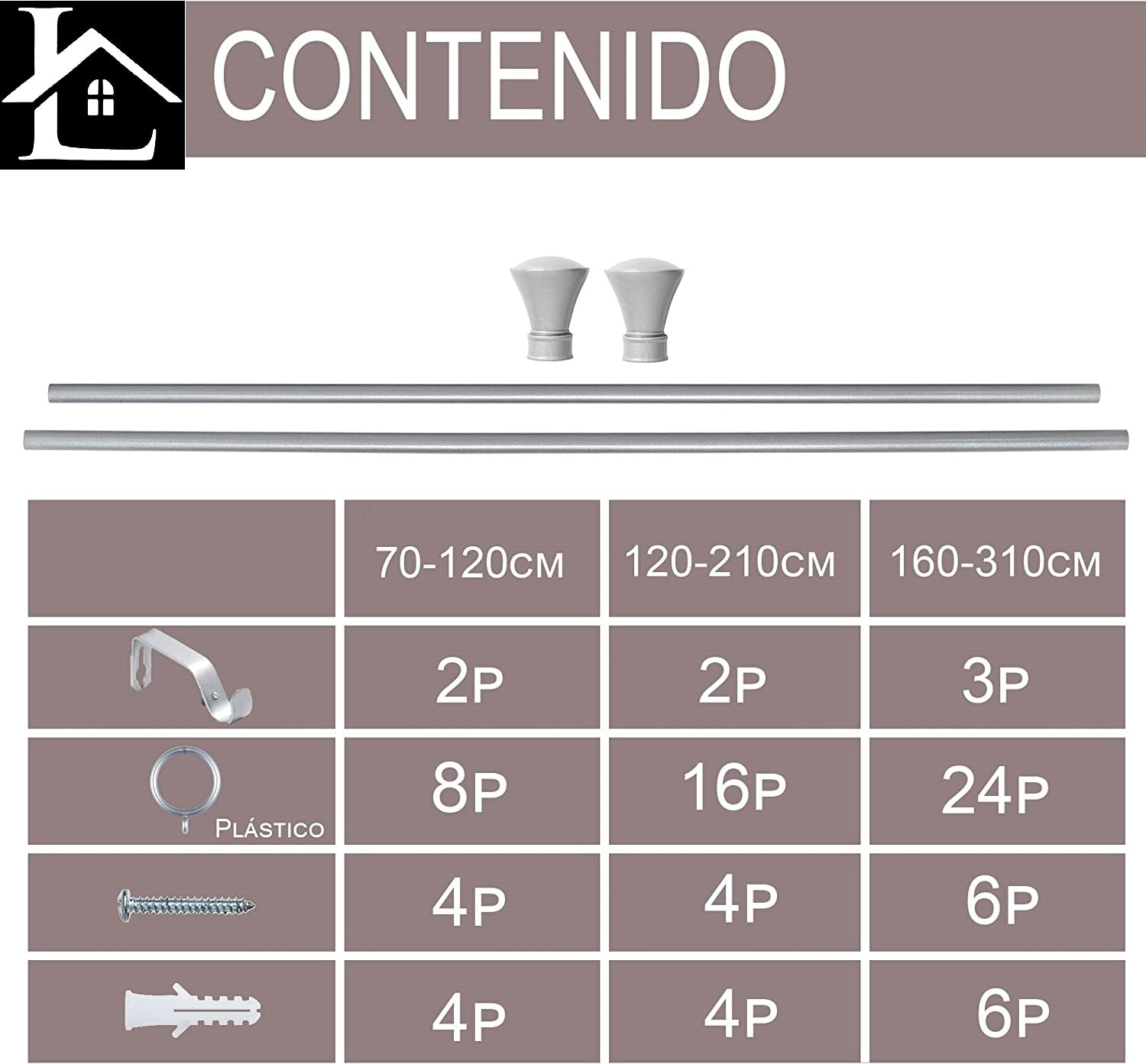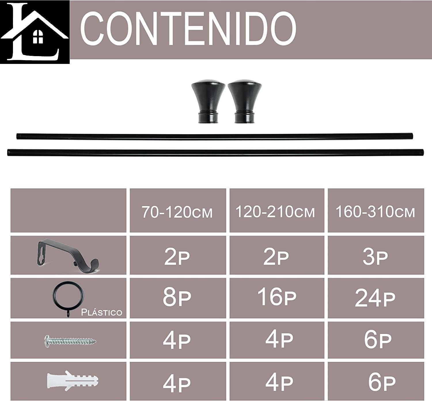 - CONTENIDO. 1 Barra de cortina, 2 soportes, 2 terminales , 16 anillos de plásticos y materiales de fijación incluidos los tornillos y tacos.